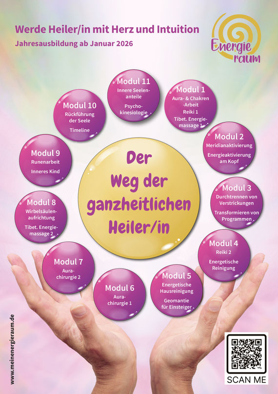 Von Januar bis Dezember 2026 kannst du dir an 11 Wochenenden über 20 effektive und erprobte Heilmethoden aneignen, die Lösung und Klärung für dich und für die Begleitung deiner Mitmenschen bieten.